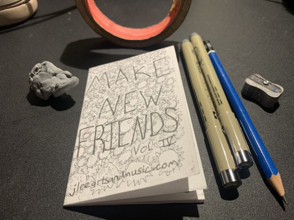 Brand New Flyer/Zine Make New Friends Vol. II. Click here for link to downloadable/printable version. I learned the 1 page zine fold technique from Mikey of Mission Mini Comix years ago. I took that teaching to the New Traditions Elementary School where my daughter went and taught all those kids what zines were and how to fold the 1 pager. Funny, years later one of the kids saw me and said they were making zines in their high school. I made a few zines for the kids including how to make noise instruments, Arabic script and Chinese characters. See, zines are a great way to teach yourself as well as teaching others and can be about any of your interests. Tip: great way to not waste time on/escape from social media/screens. Make New Friends features the musicians I play shows with. The reverse side is the flyer for the show (this time designed by my friend in Scotland). Playing live shows is all about getting people out and presenting the chance to meet new people, so this zine is about that, but also a little background on the performers. It’s a tiny thing, but it’s an old DIY community music scene building praxis we need more of. MNF is about people and their creativity, sharing their methods, giving their point of view, humor. Unprofessional and unabashedly amatueristic. I I have a few copies left, contact me if you want one. Also as noted, you can print it out for yourself. Follow above link to the PDF. Print it for two sided and follow the rough guidelines for the folds. It should be 8 panels. Fold “hamburger” wise and cut in the center/middle between the two inner panels. Press together “hot dog” wise. The cut should form a diamond shape when folding into the zine/booklet (check out this YT vid for a visual). Shout out to Adrian at our local print shop for always coming through with the graphic design strategies for all my weirdo ideas.